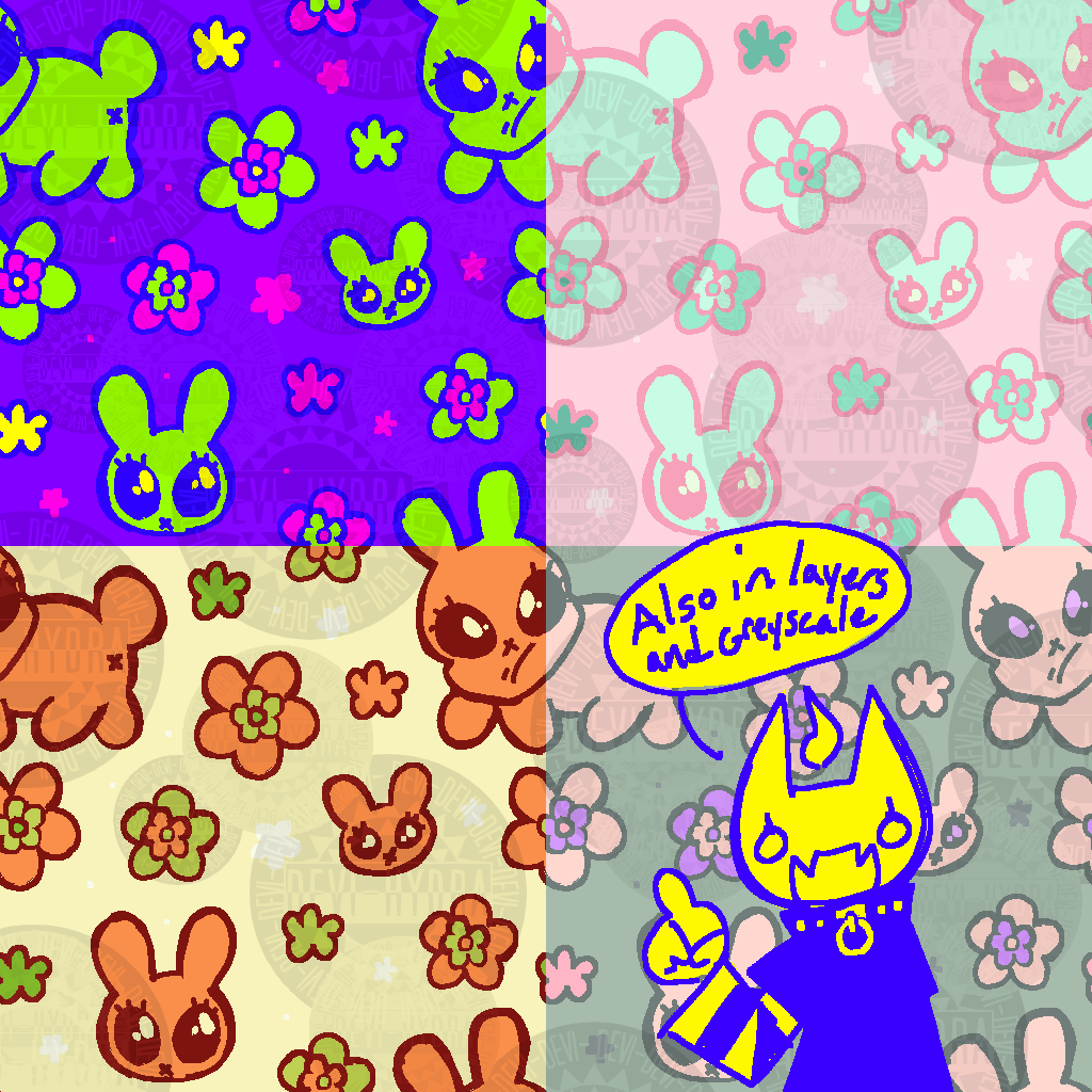 An alien bunny pattern made by me. As said in my little speech bubble, the individual layers and a greyscale version are available in the zip and rar files for customizability.